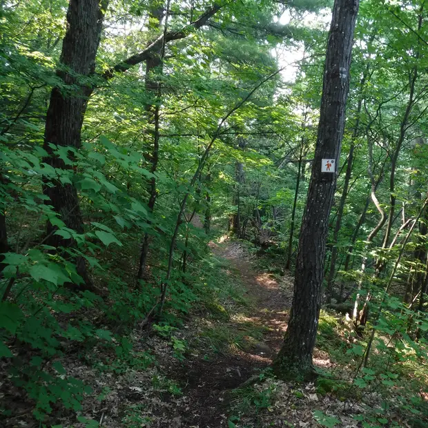 A pleasant trail network in a mature hardwood forest enhanced by permanent outdoor art. The waterfall won’t disappoint!